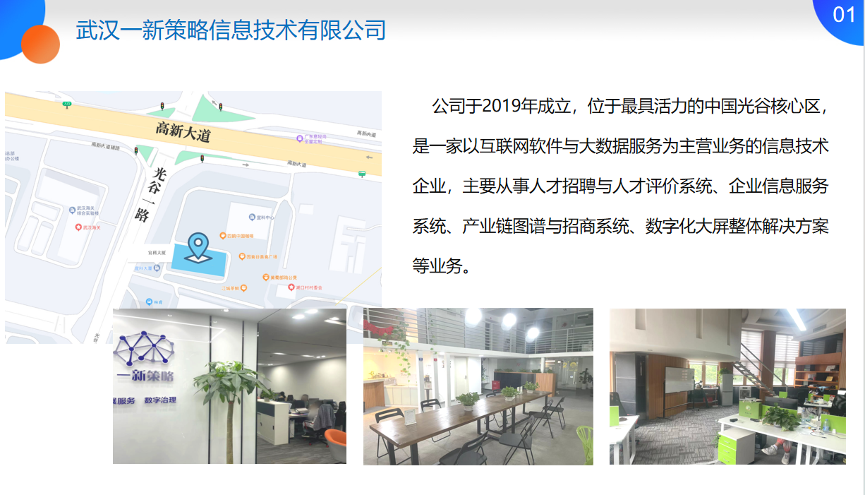 公司于2019年成立,位于最具活力的中国光谷核心区,是一家以互联网软件与大数据服务为主营业务的信息技术企业,主要从事人才招聘与人才评价系统、企业信息服务系统、产业链图谱与招商系统、数字化大屏整体解决方案等业务。